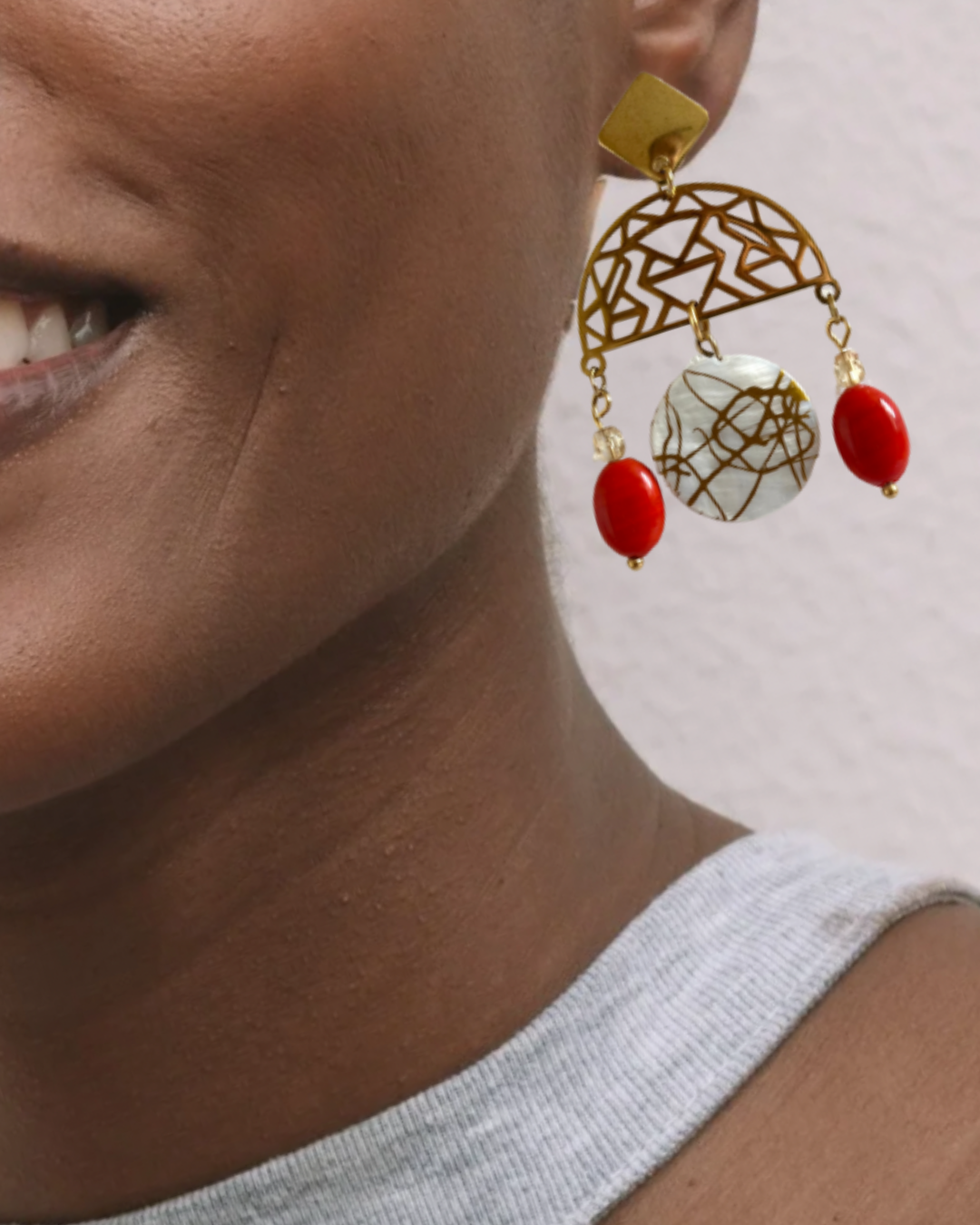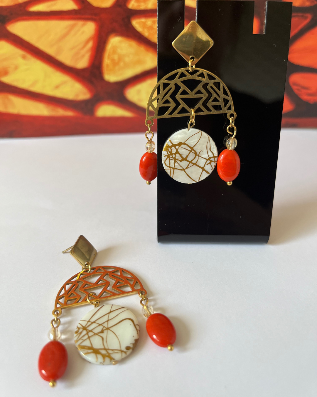 Boucles d’oreilles réalisées avec au centre une perle en nacre et des perles en céramiques. Pendentif et attaches en acier doré.