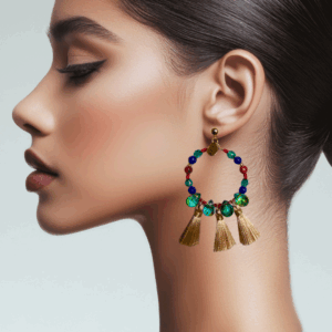 Jolies créoles composées de perles en verre, de perles en acier et intercalaires en Zirconium. Diamètre 4,5 cm. Attaches filigrane en acier doré qui repose sur le lobe 1 cm.