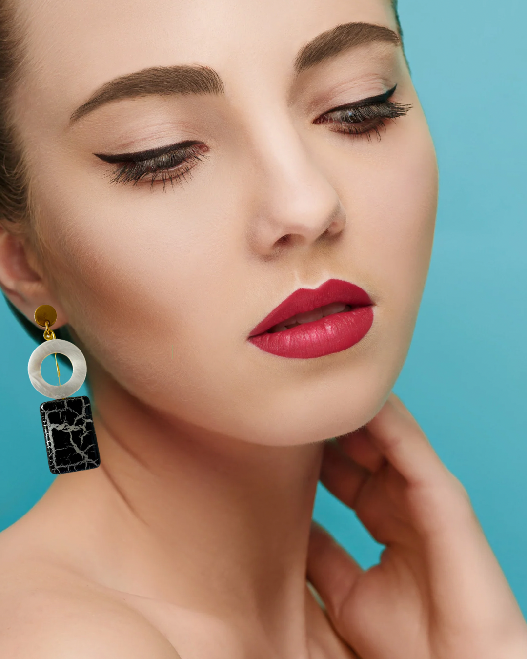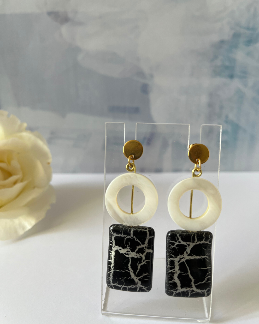 Caractéristique du bijou : Pâte d’argile polymère Pierre minérale et organique : Nacre Métal : acier inoxydable hypoallergénique